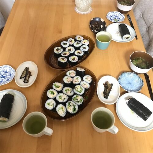 今年の節分も巻き寿司を作りました。 まるかぶりする分だけ置いておき、いろんな味が楽しめるように他は切ってしまいました。 具はマグロ、サーモン、かに、ツナマヨなど 鏡開きのときに作ったぜんざい、冷凍しておいたのを食べました。 夫が帰国した際、空…